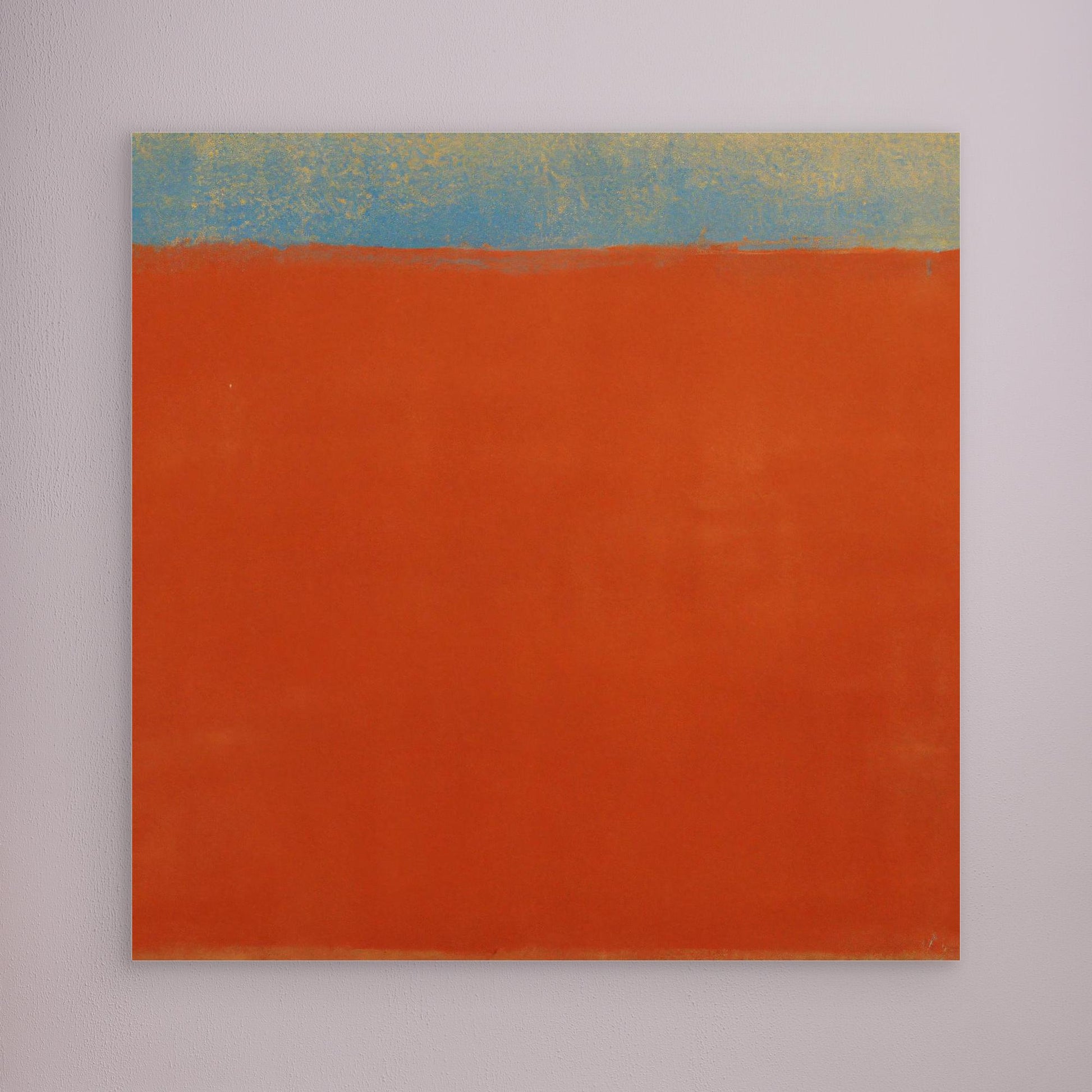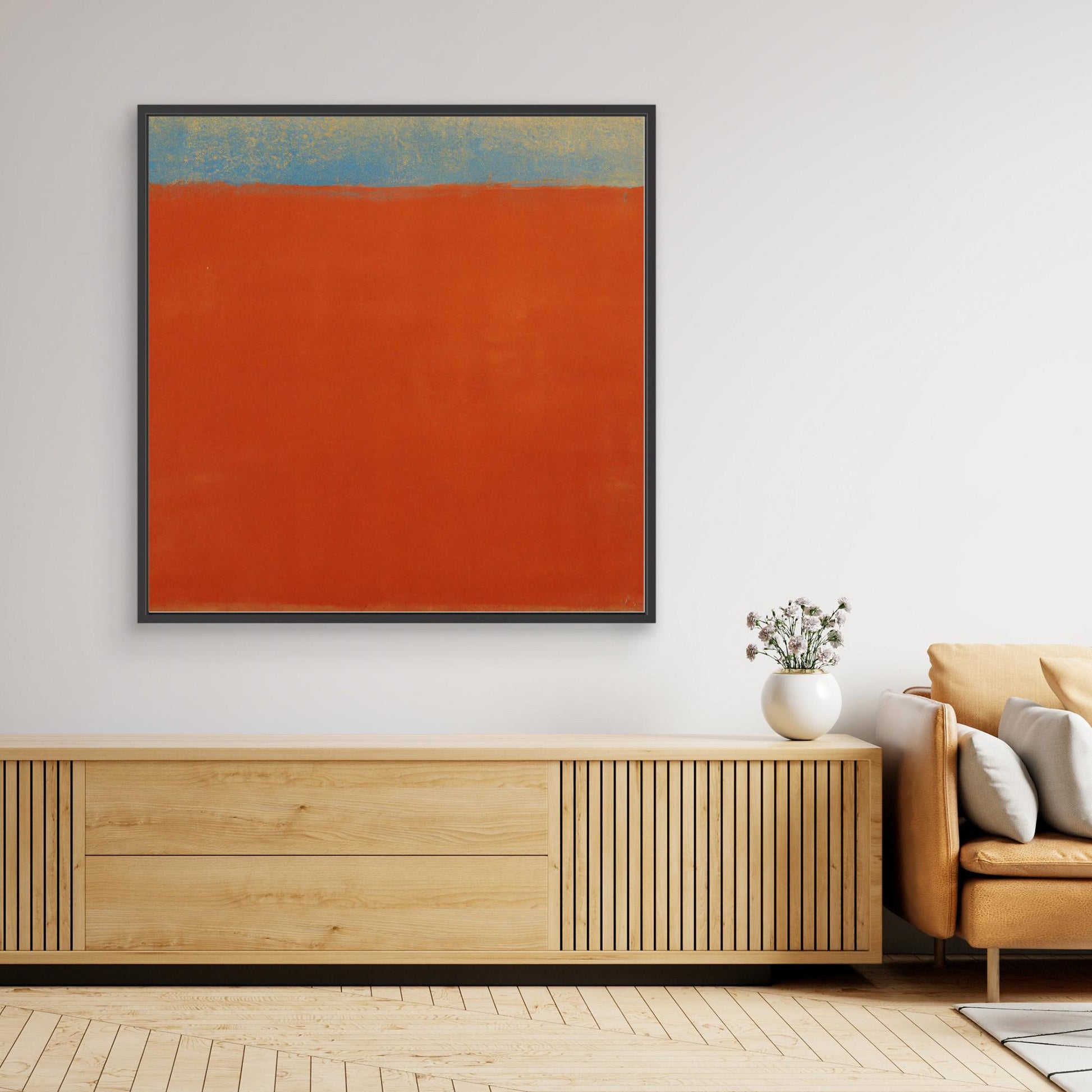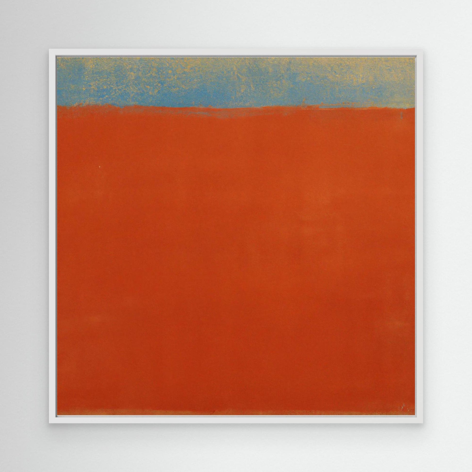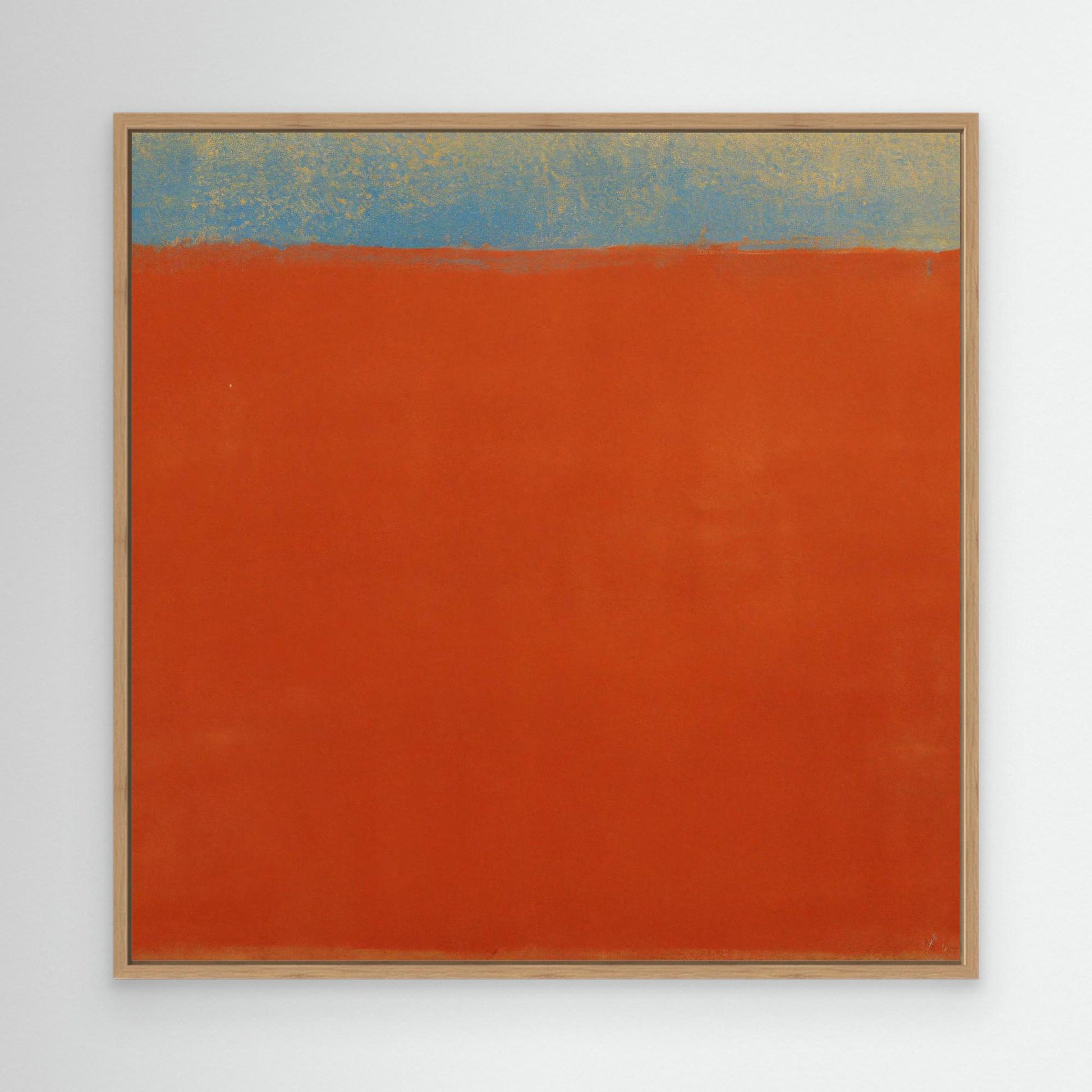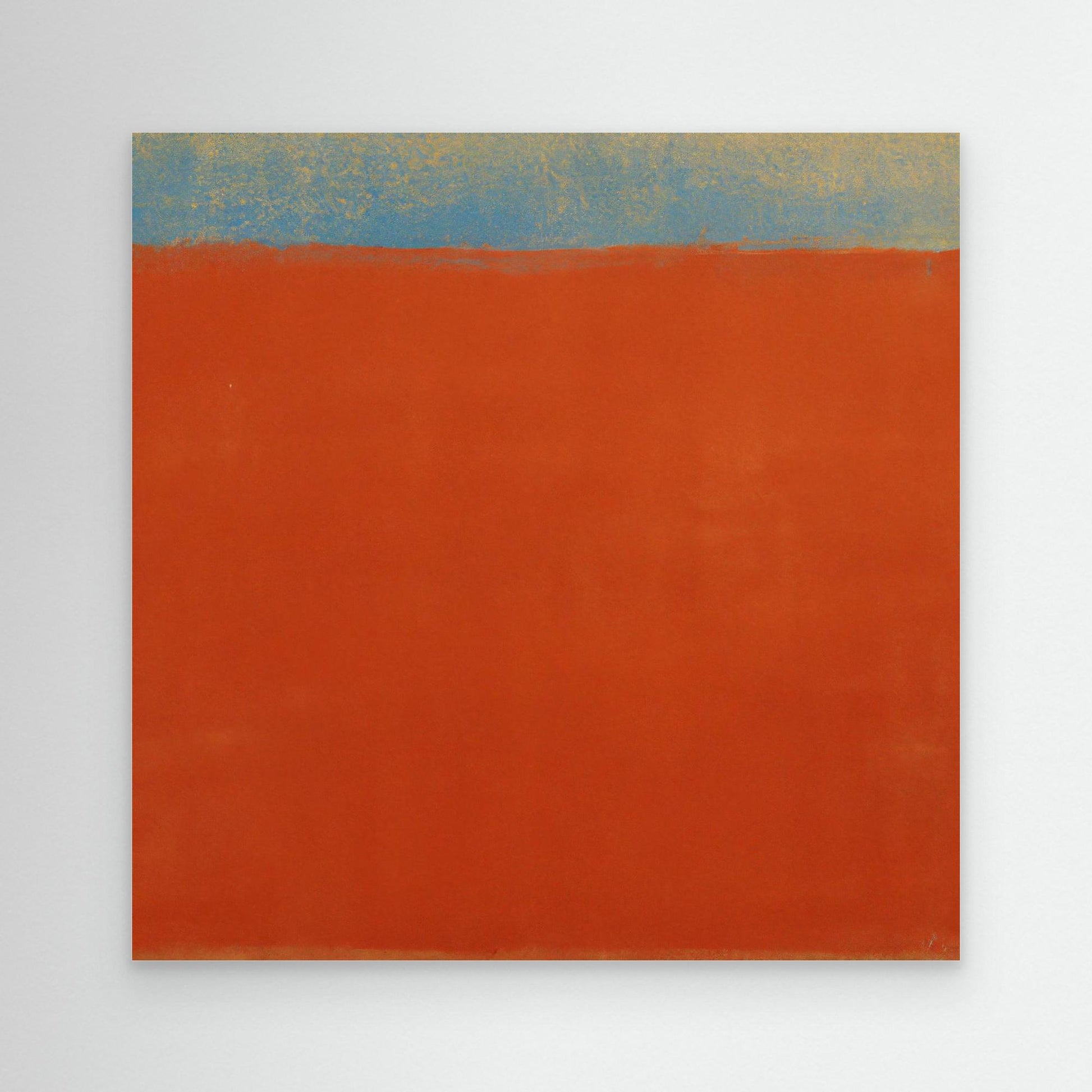 A bold expanse of red/orange grounds the canvas, crowned by a strip of soft sky light blue/grey. This work embraces the simplicity of color as pure emotion — intensity against calm, fire against air. Like a horizon line at dusk, it’s about stillness, vastness, and the quiet weight of color.